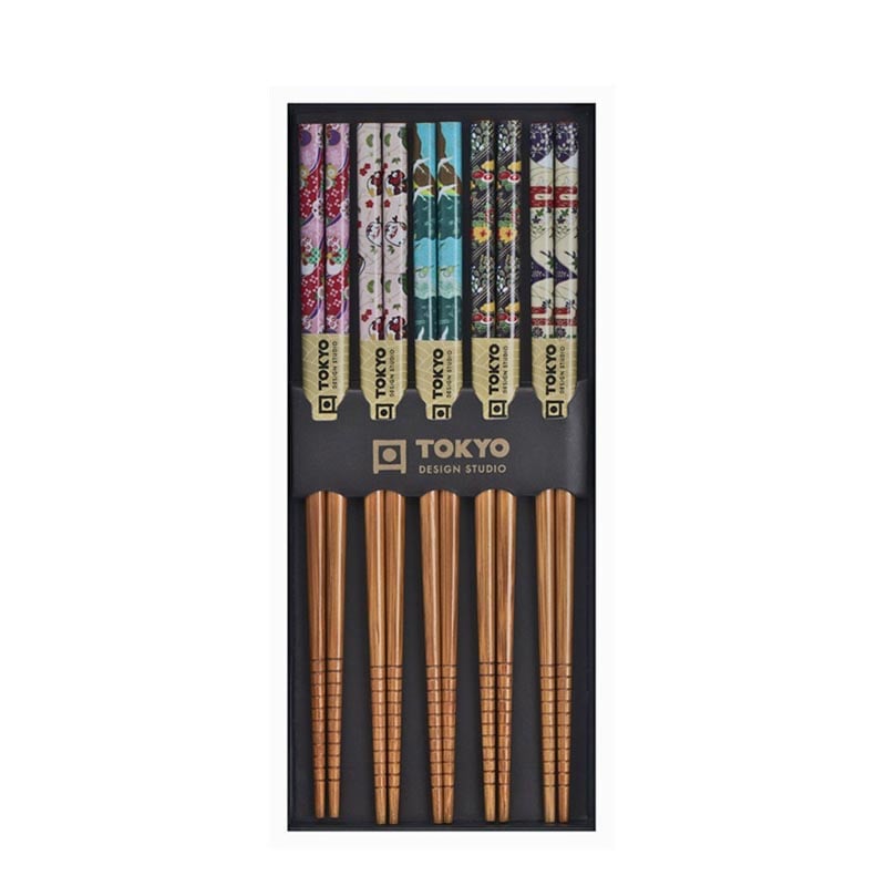 Fünf Paar bunte Essstäbchen mit geriffelter Oberfläche, perfekt für Sushi, damit man einen guten Griff hat. Die Motive zeigen verschiedene japanische Muster und Designs.