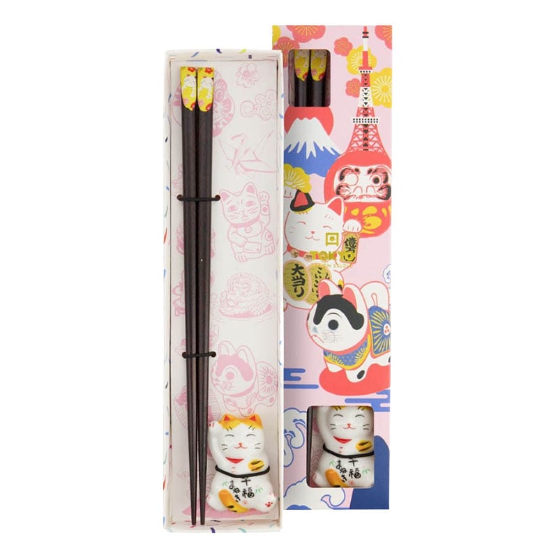 Essstäbchen mit Lucky Cat & Stäbchenablage Gelb