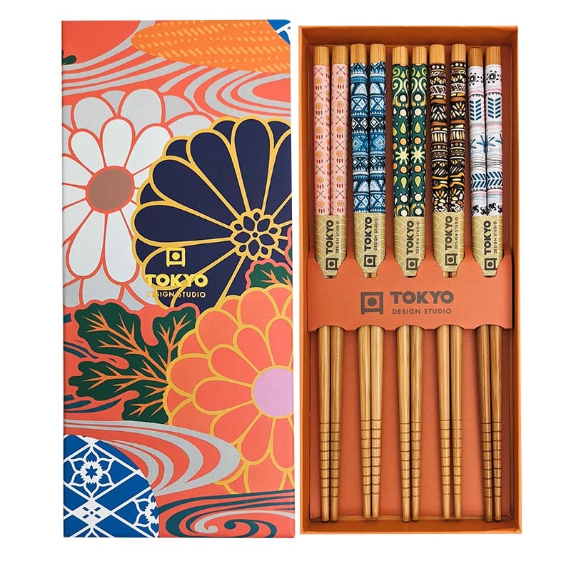 Fünf Paar Essstäbchen aus Bambus in einer coolen Geschenkbox. Ein wirklich tolles Design, inspiriert von allen einzigartigen und coolen Mustern der Natur – Blumen, Meer, Grün und Pflanzen. Jedes Paar Essstäbchen hat ein einzigartiges Design, sodass jedes Familienmitglied ein individuelles Paar auswählen kann. Sie liegen gut in der Hand und sind dank der schönen Box perfekt als Geschenk geeignet. Fünf Paare.
