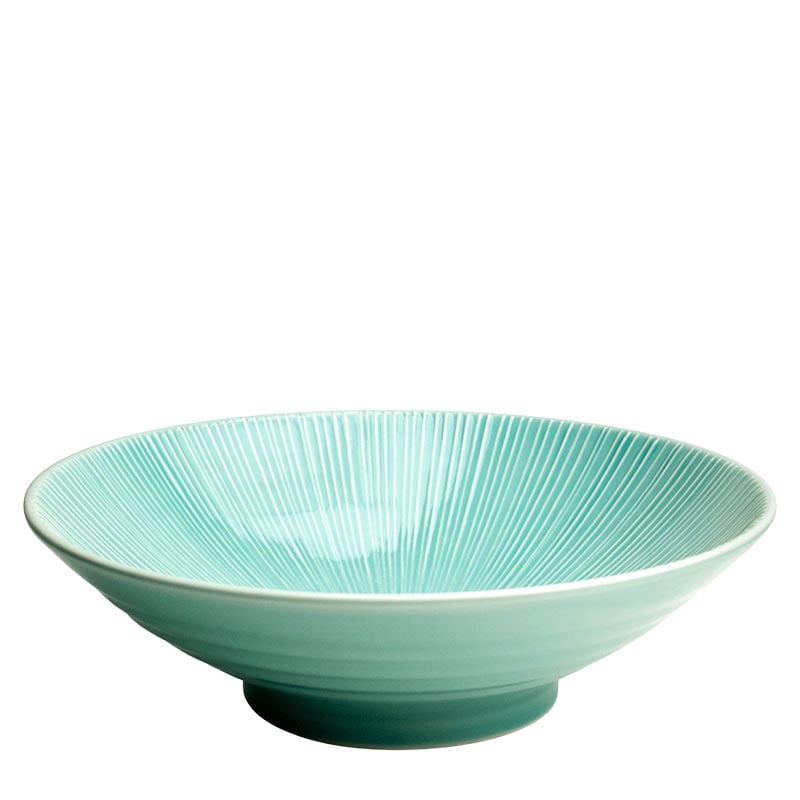 Eine wirklich schicke, tiefe und breite Schale aus Japan in rustikalem Design und türkisfarbener Farbe. Dank ihrer Form perfekt für verschiedene Gerichte geeignet. Passt gut zu allem, von Nudelsuppen wie Ramen und Udon bis hin zu Wokgerichten und Bibimbap. Misst 24,5 cm im Durchmesser und 7,5 cm in der Höhe.