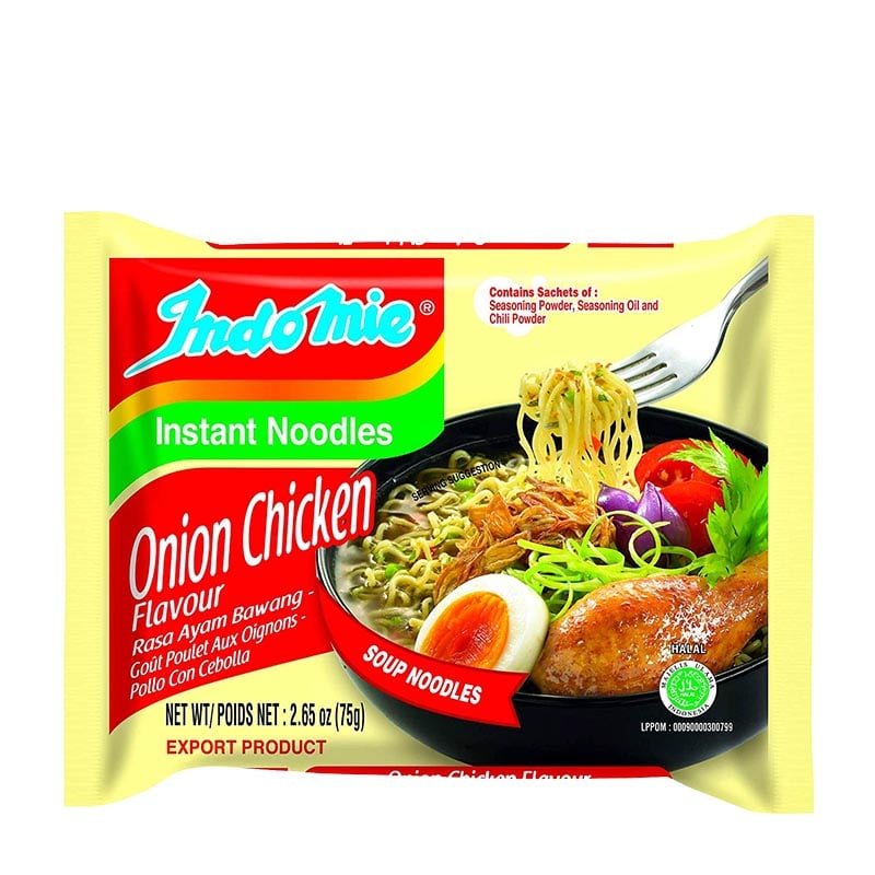 Indomie gehört zu den weltweit bekanntesten Instantnudeln aus Indonesien und beeindruckt immer wieder mit fantastischen Geschmacksrichtungen. Diese Nudelsuppe überzeugt mit einem herrlichen Aroma aus Zwiebeln und Huhn. Koche die Nudeln drei Minuten lang in 350ml Wasser und füge dann die Gewürzmischung hinzu. Für ein noch intensiveres Geschmackserlebnis kannst du gebratenes Hähnchen und Zwiebeln als Garnitur hinzufügen. 75g.