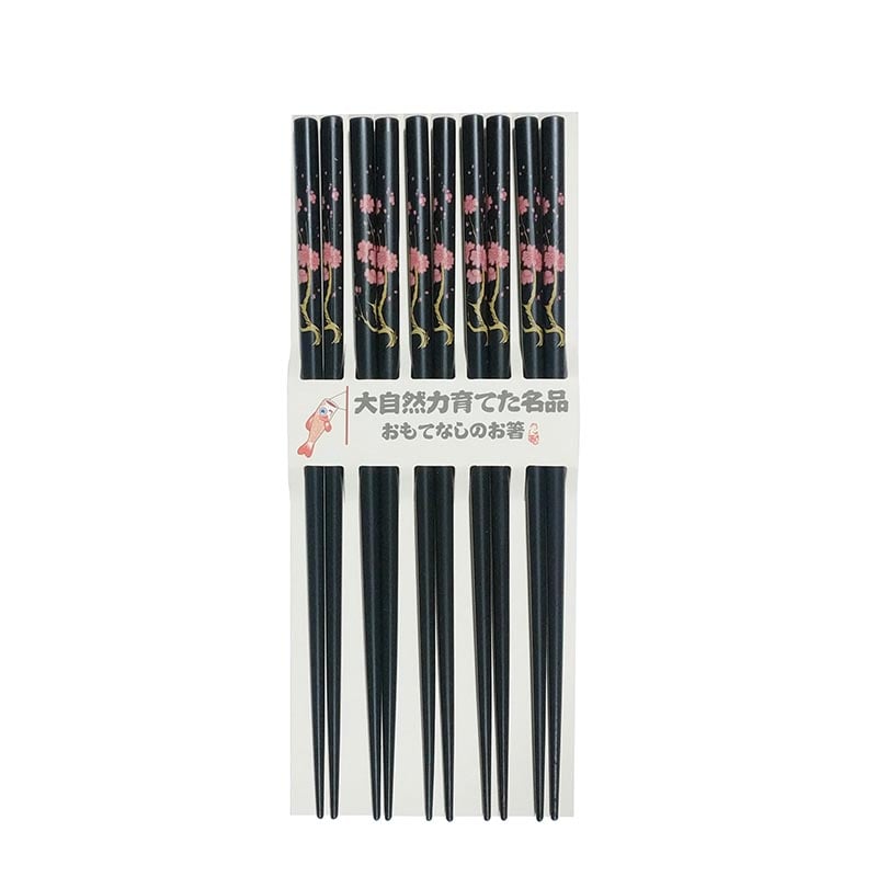 Elegante schwarze Essstäbchen aus Holz mit einem schönen Kirschblütenmuster, das sich bis zum Griff hinaufzieht. Dieses Set enthält fünf Paar preiswerte Essstäbchen – perfekt für alle, die eigene langlebige und stilvolle Stäbchen besitzen möchten, anstatt Einwegstäbchen zu nutzen. Eine ideale Wahl, um das Essen noch genussvoller zu gestalten.