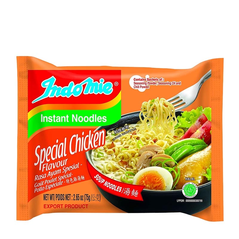 Eine köstliche Hühnernudelsuppe von den indonesischen Spezialisten Indomie! Die würzige Brühe mit Noten von Huhn, Zwiebeln und Knoblauch bietet eine perfekte Basis für ein leichtes Essen. Zubereitung: Nudeln in 350 ml Wasser 3 Minuten kochen, dann die Gewürze hinzufügen. Garniere mit Kräutern, gekochtem Ei oder Hühnerstücken für ein vollwertiges Gericht. 75g.